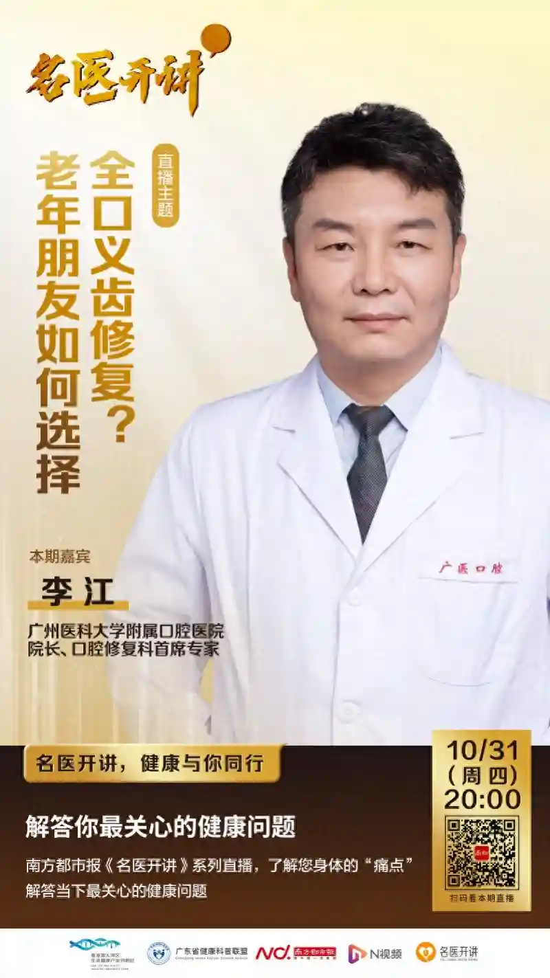 10月31日晚8点,南都“名医开讲”第十五讲将邀请广州医科大学附属口腔医院院长、口腔修复科首席专家李江教授为大家带来一场以《老年朋友如何选择全口义齿修复?》为主题的健康科普讲座,我们将一起深入了解全口义齿修复的健康密码。欢迎大家收看。